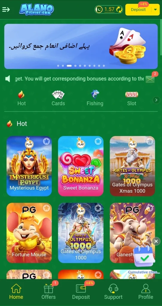 Inside the app, you’ll find multiple gaming categories fishing battles, slots, crash games, card flips, and spin wheels all optimized for low-storage phones. The game offers daily check-in rewards, cashback bonuses, and an active referral system, making it more than just a game it’s a daily earning platform that works reliably. same like you can also try Alano DT6 Game and enjoy real earning by playing games.